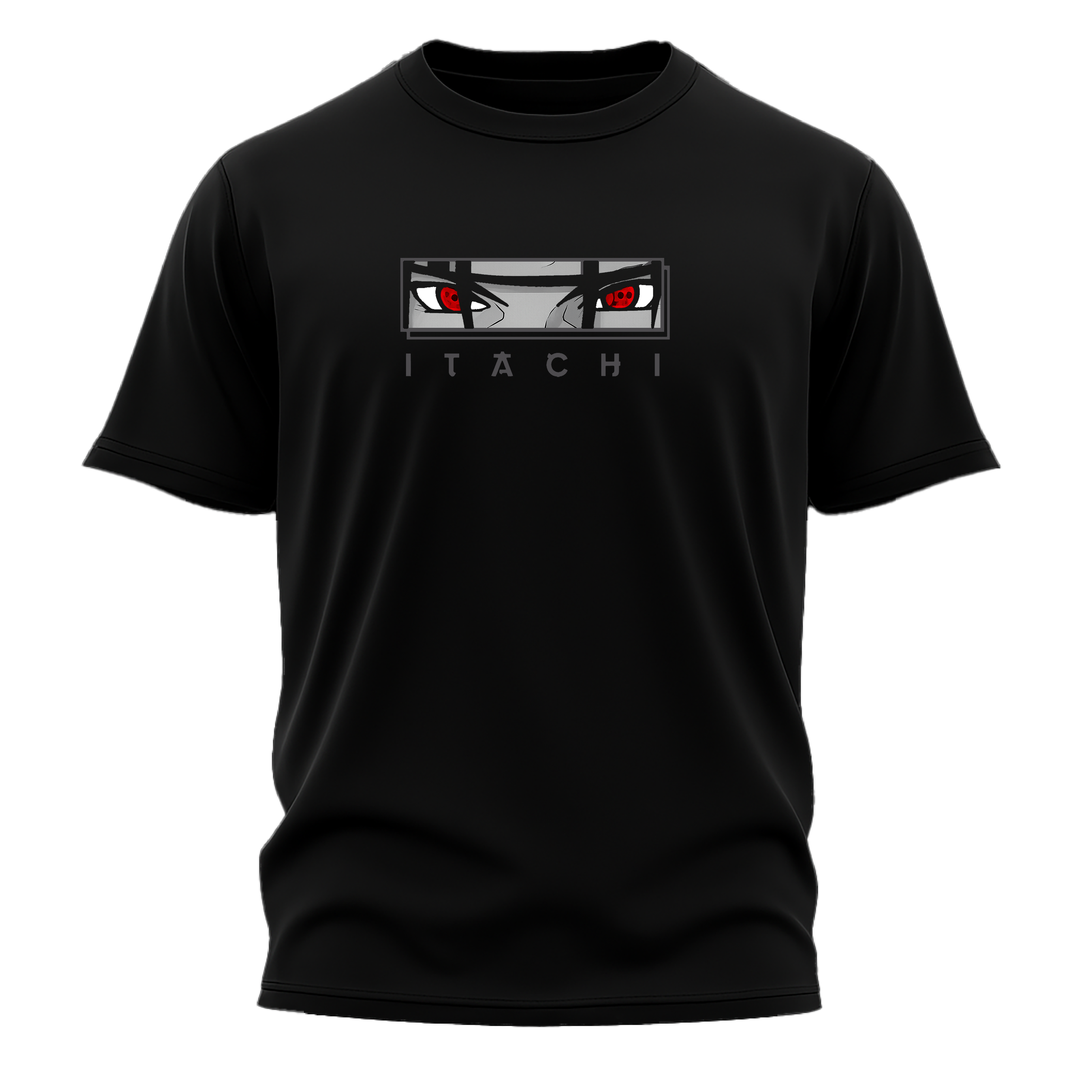 The front side showcases a minimalist yet powerful graphic of Itachi Uchiha’s Sharingan eyes, creating a bold and mysterious aesthetic.