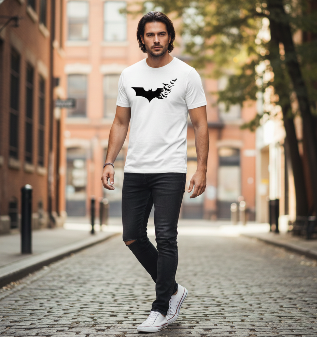 Iconic Bat Symbol Design: Bold white logo on a classic White tee.