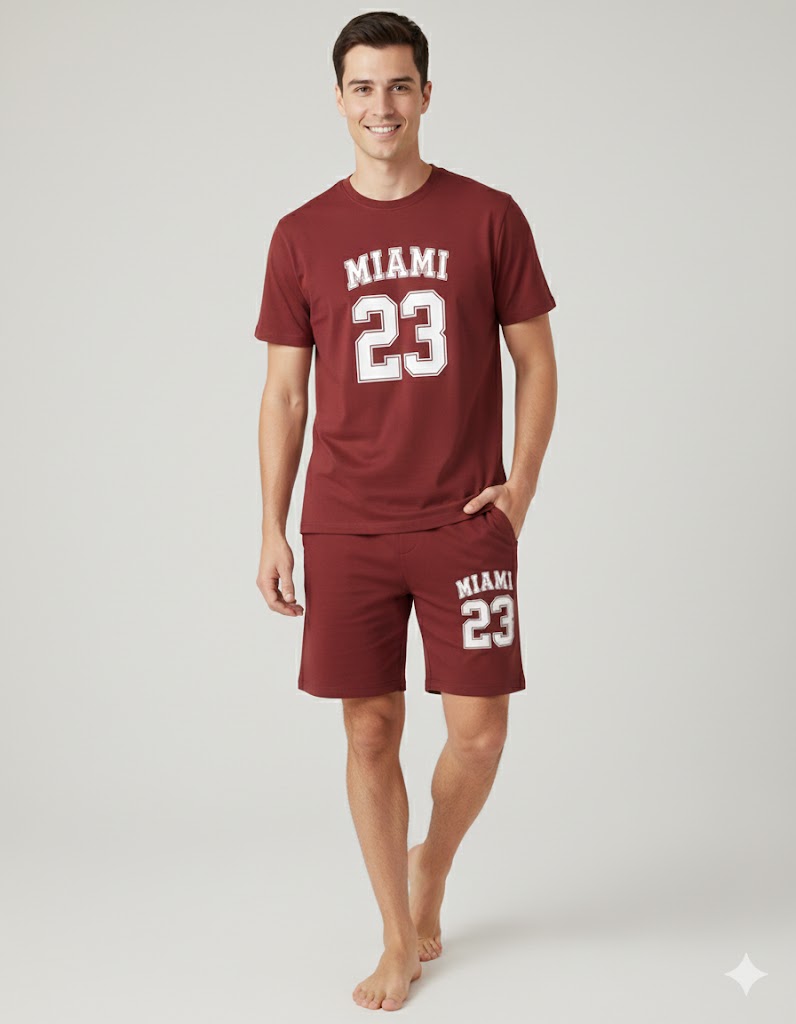 xElevate your casual wardrobe with this ultra-comfortable and stylish T-shirt and shorts matching set. Designed for maximum mobility and breathability, the fabric is perfect for your workout, a summer outing, or simply relaxing as loungewear. Featuring the popular "MIAMI 23" print in a classic collegiate font, this set offers a contemporary streetwear look. The shorts include a comfortable drawstring waist and practical pockets. Perfect for summer fashion and activewear versatility.