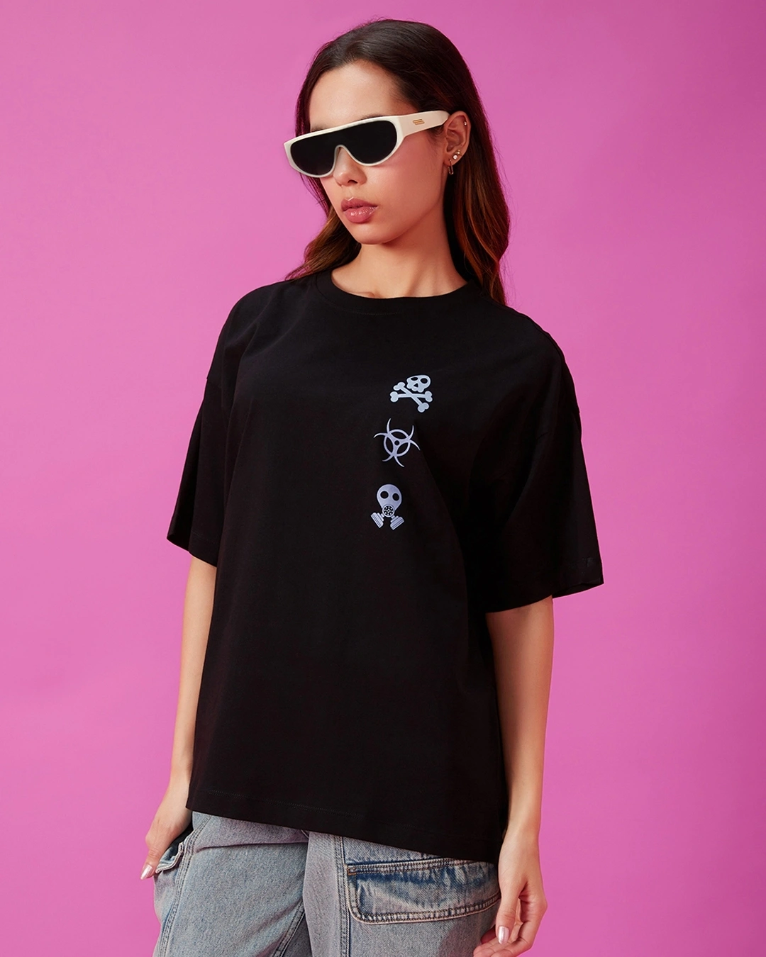 Make a bold, unapologetic statement with our Black Oversized Danger Graphic T-Shirt. Featuring a high-contrast neon cyan graphic, this tee perfectly captures the essence of retro futurism and the punk aesthetic.